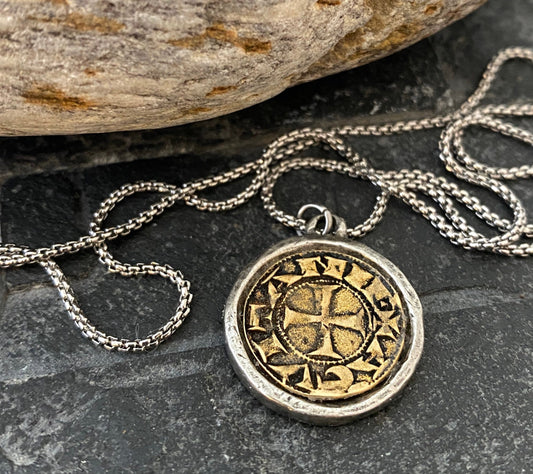 Old Spanish Coin Men's Necklace, Shipwreck Pirate Cross Pendant Brass Two Tone Mixed Medal, Unisex Jewelry, ST-030