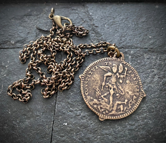 Men's Archangel St. Michael, Antiqued Brass and Bronze Unisex Jewelry, 20 or 24 Inch Rolo Chain, BR-039