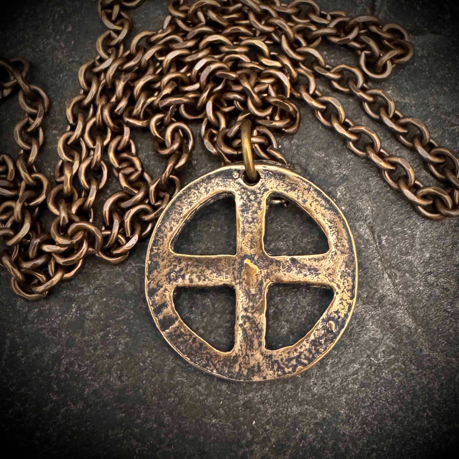 Merge ancient symbolism with contemporary design in this bronze Circle Cross necklace. The pendant features a cross within a circle, embodying a sense of unity and wholeness with its geometric harmony. Its textured, almost timeworn finish adds a layer of depth and mystique to the piece, while the pendant's simple elegance is enhanced by the robust bronze chain from which it hangs.