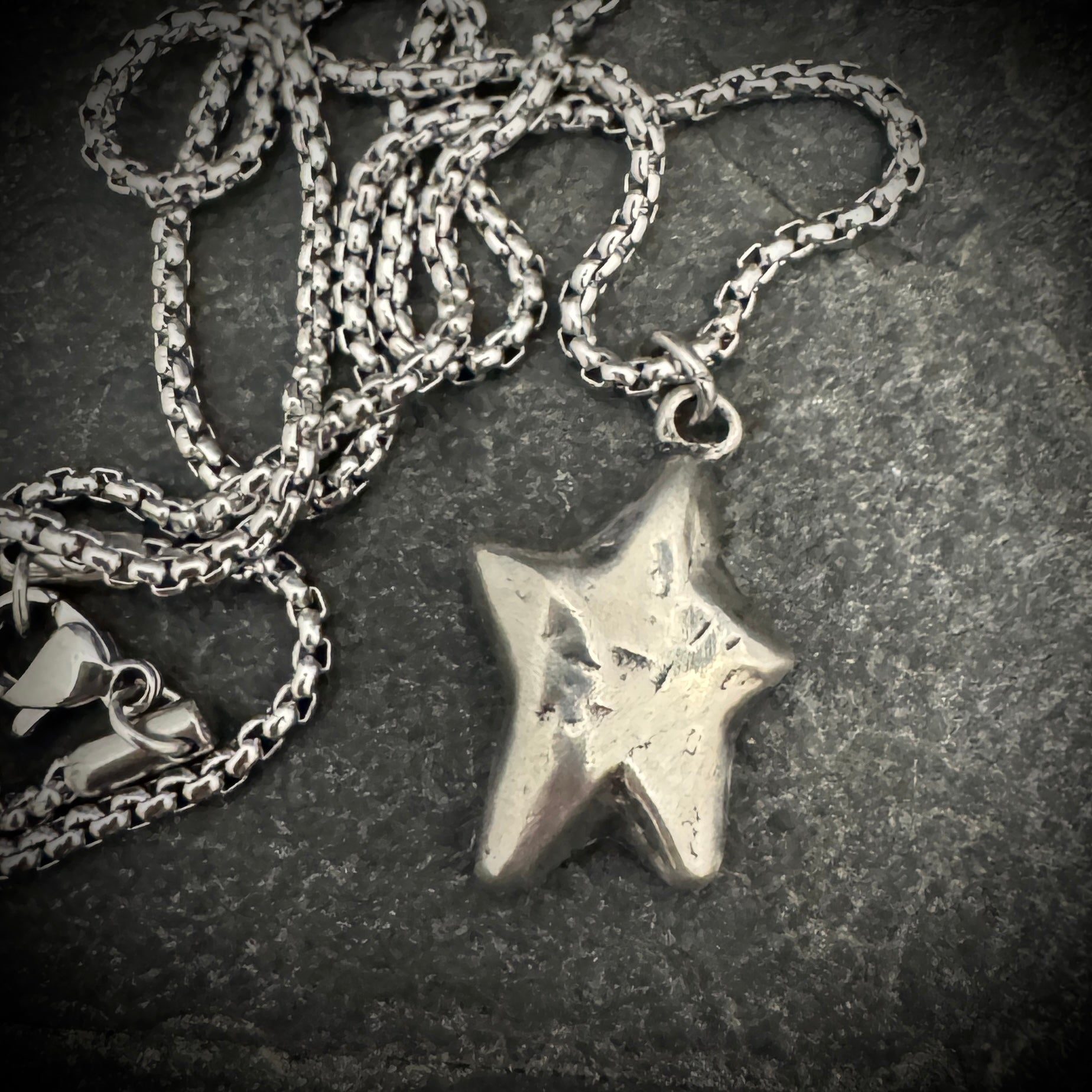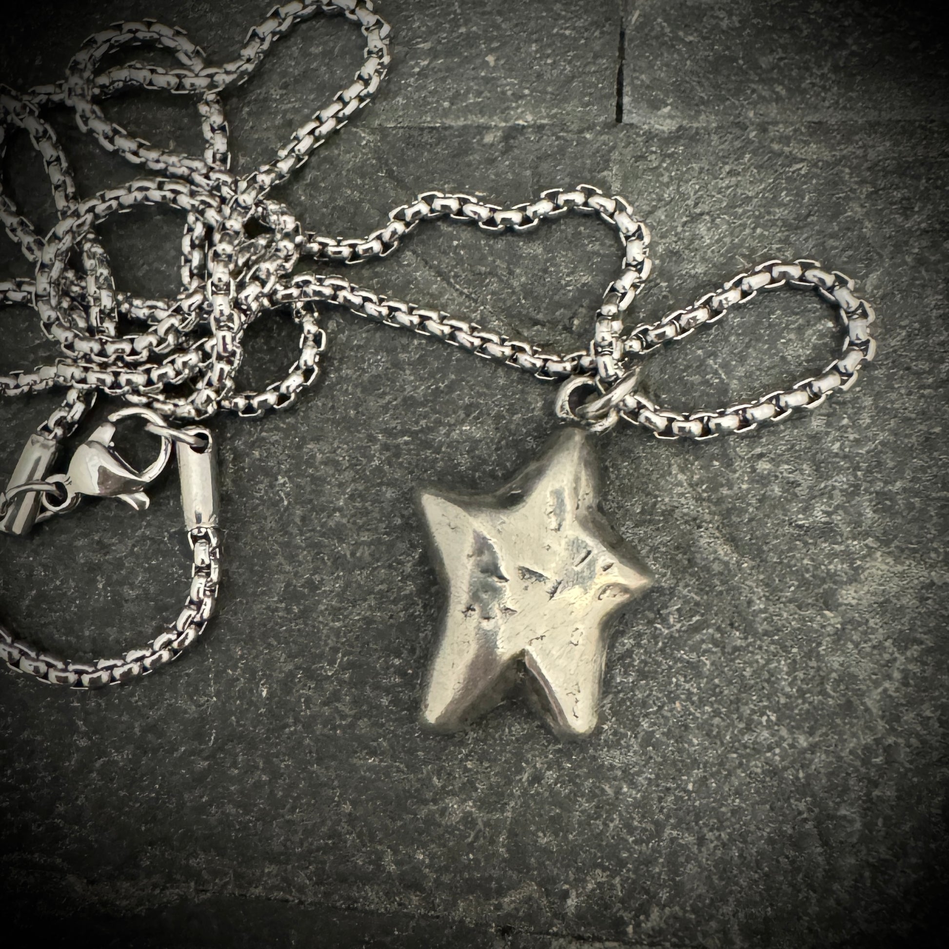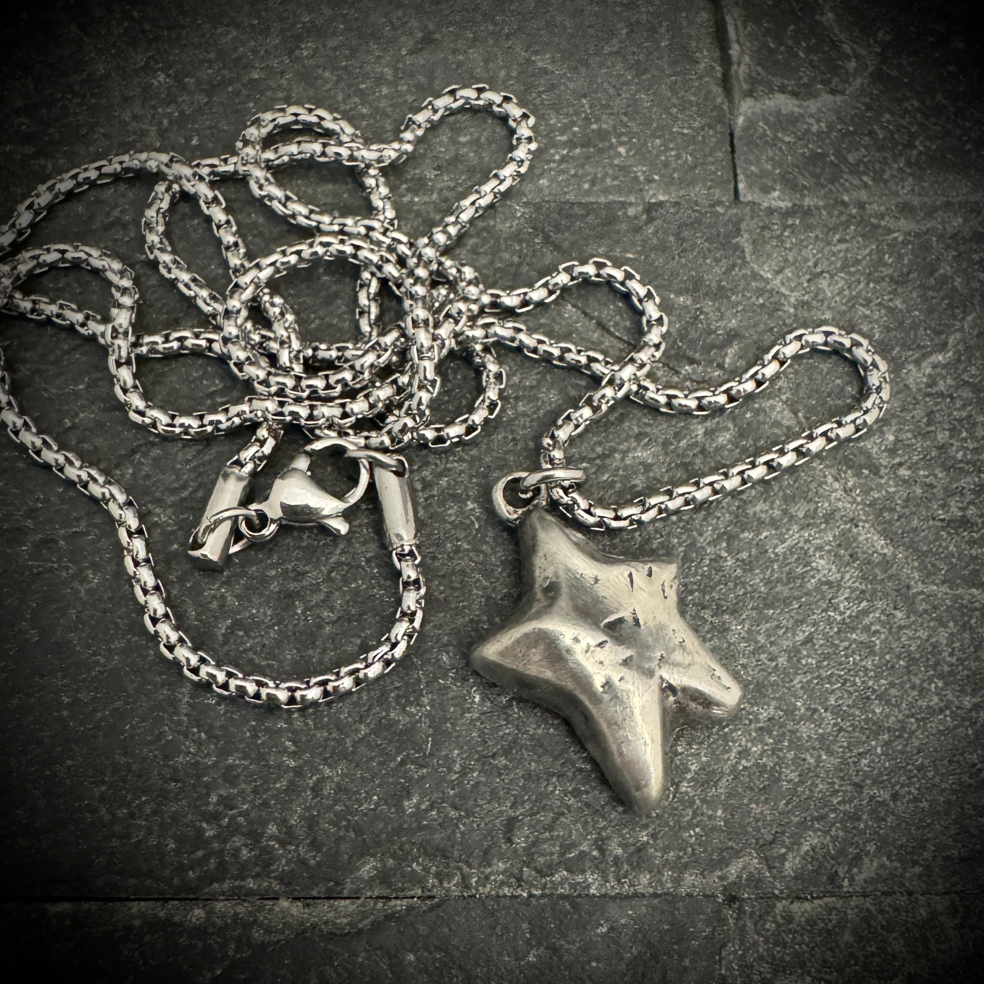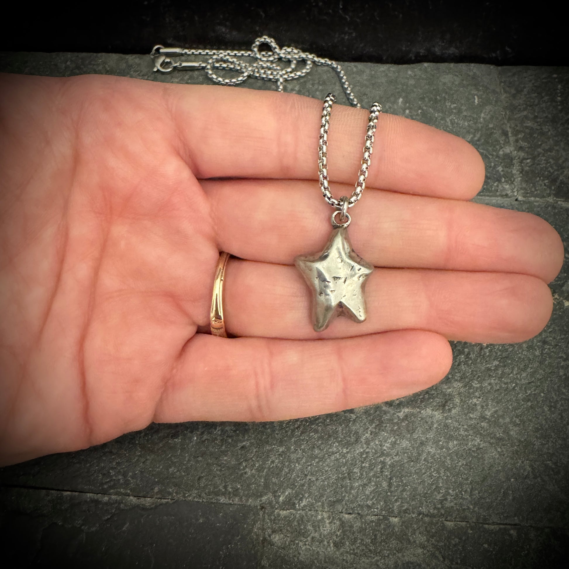 Shine with a celestial charm in this Hand-Formed Star necklace. Each angle and facet of the star pendant is hammered to perfection, giving it an organic texture that captures the light in a dance of shadows and brilliance. Dangling from a complementary chain, this piece is a celebration of the unique beauty found in handcrafted artistry, making it an ideal treasure for those who wish to carry a piece of the stars with them.