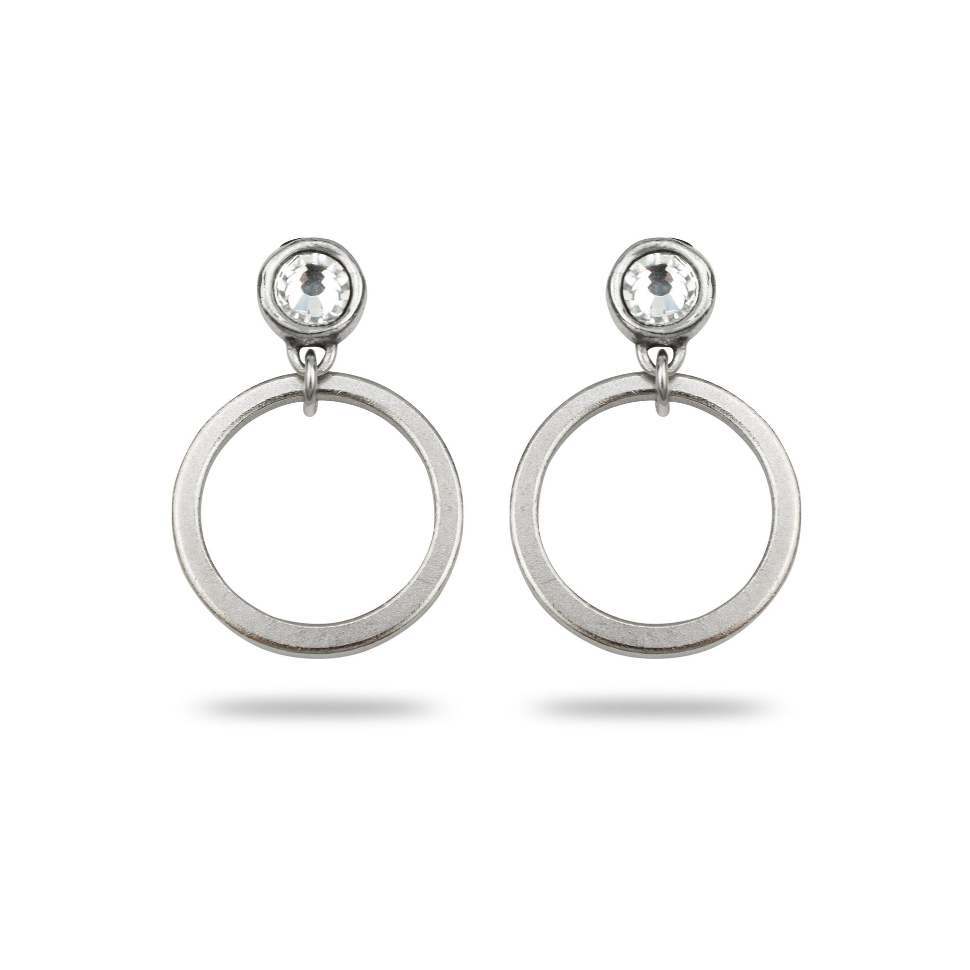 Forged with precision, each hoop is plated in an oxidized sterling silver, providing a sumptuous matte finish that exudes understated luxury. The design is elevated by a single, bezel-set crystal at the lobe, offering a subtle sparkle that catches the light with every turn.
