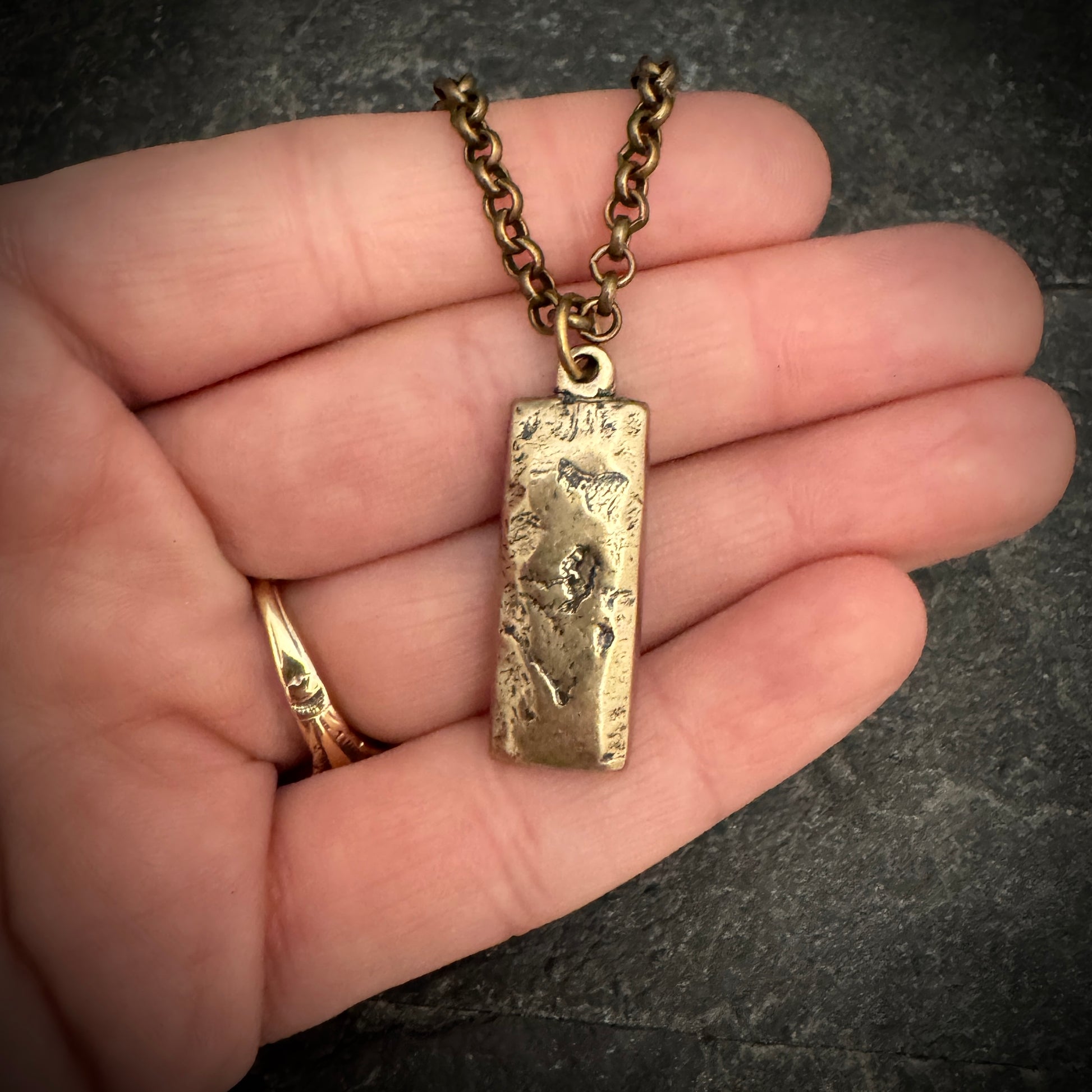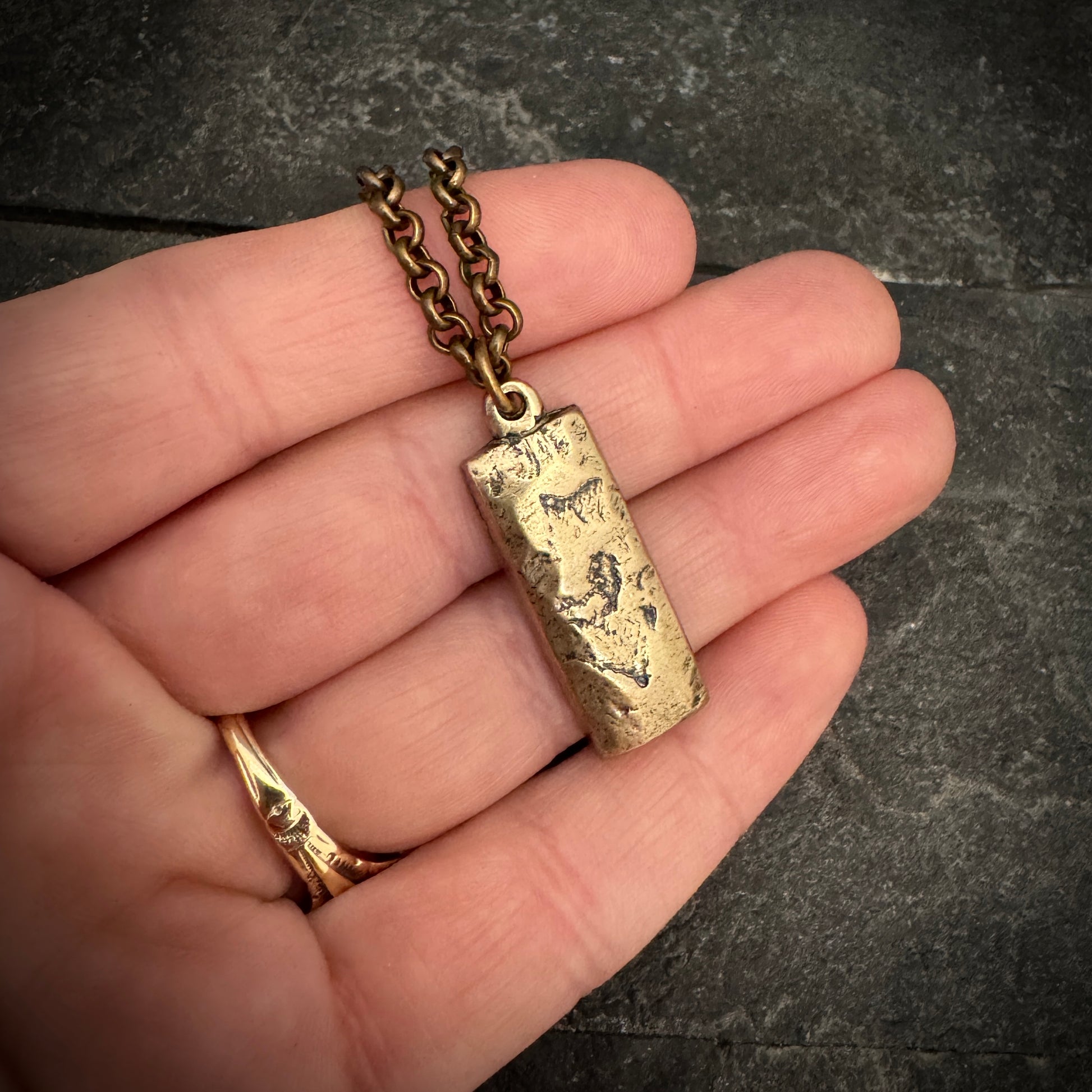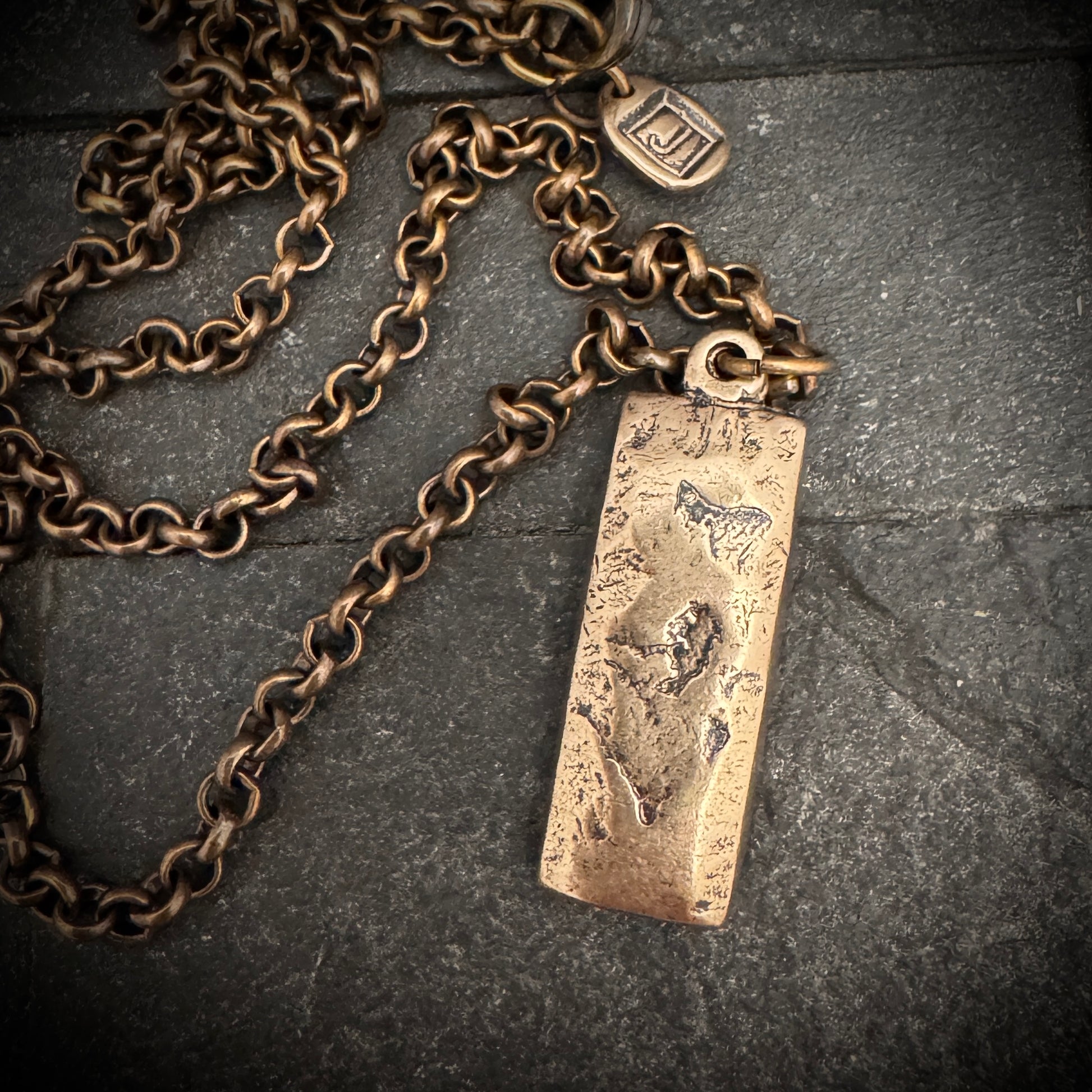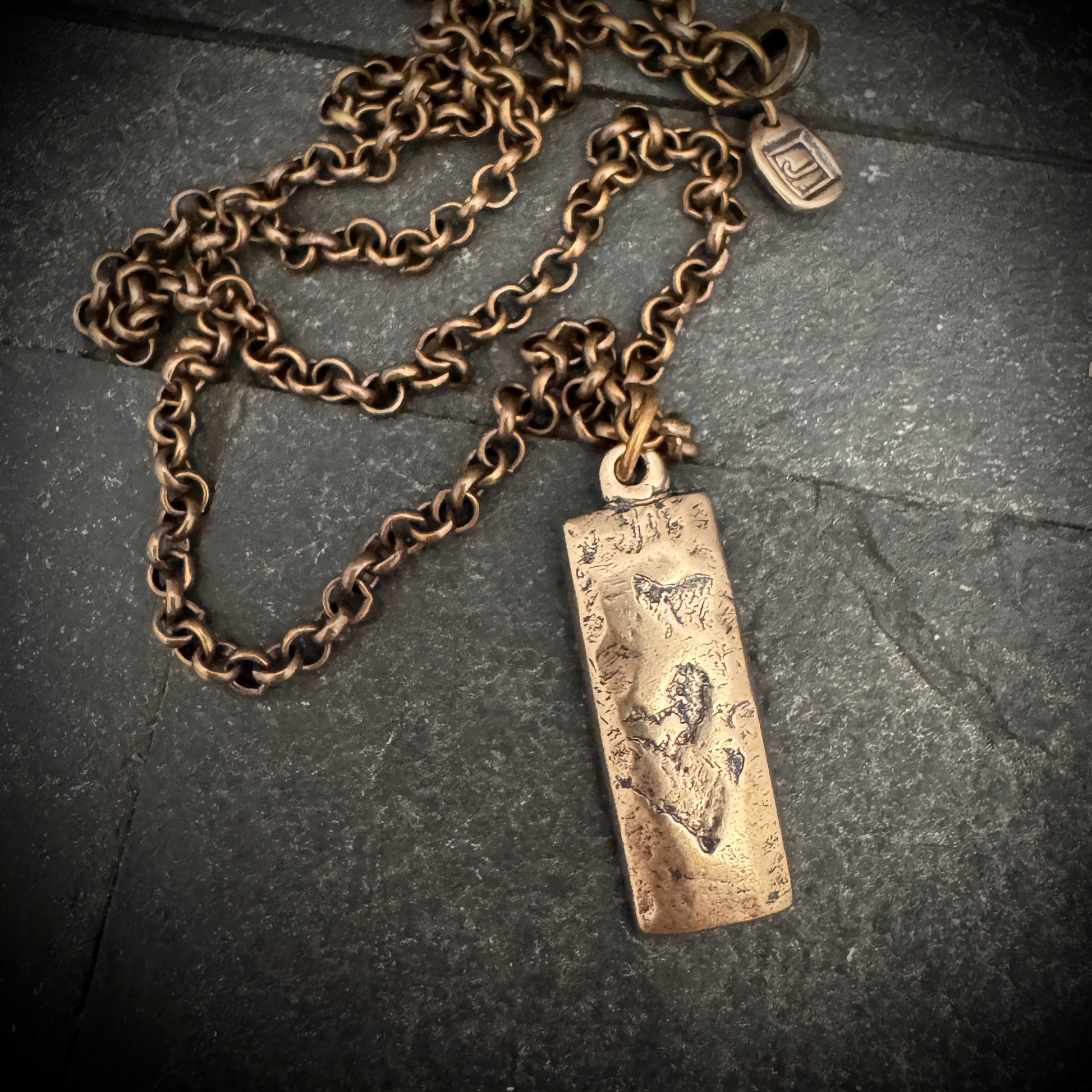 Our Hammered Bar is a bronze necklace that features a slender bar pendant with a hammered texture, evoking an artisanal, handcrafted aesthetic. The surface, marked with the unique imprints of the hammering process, catches the light in a play of shadows, adding depth and character to the piece. Elegant in its simplicity, the pendant hangs on a matching bronze chain, perfect for layering or as a standalone statement of rustic sophistication.