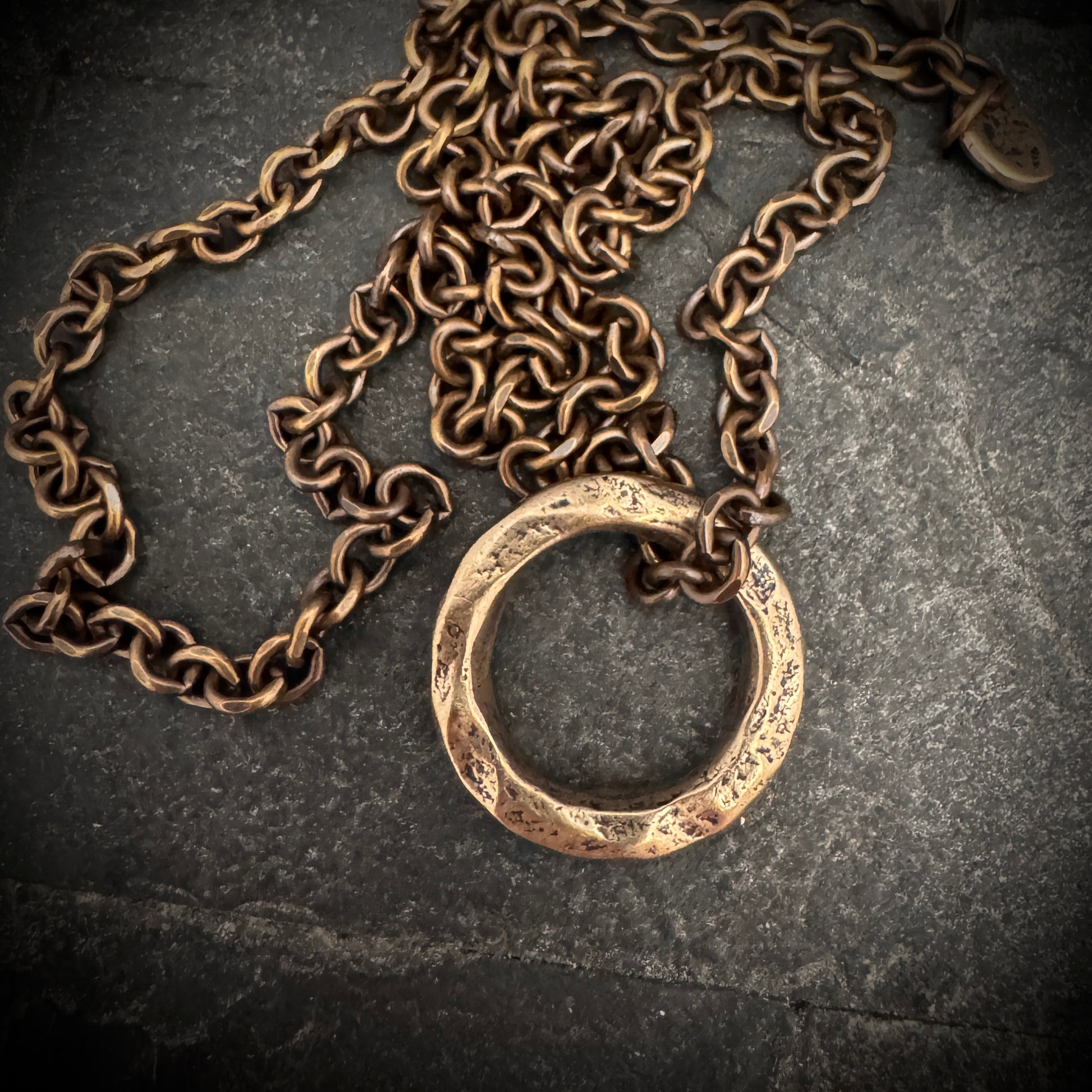 Embrace minimalist sophistication with our bronze Hammered Ring necklace, a symbol of unity and infinity. The textured surface of the ring reflects a hand-forged appearance, giving it an artisanal touch. Dangling from a durable bronze chain, this necklace is a versatile accessory that offers a subtle statement and complements any outfit with its understated elegance.