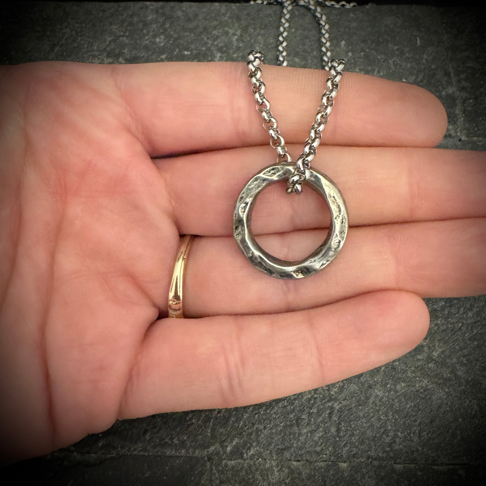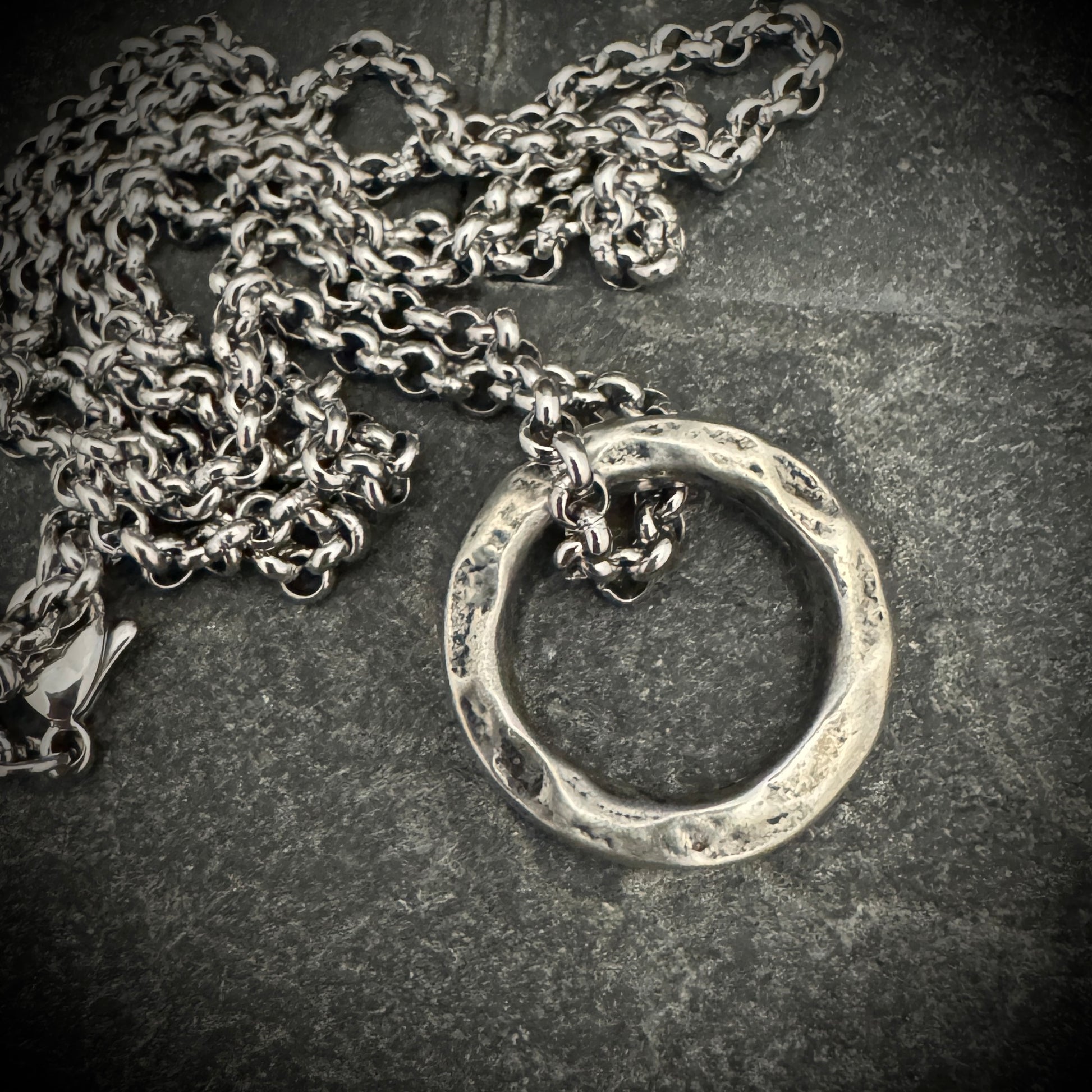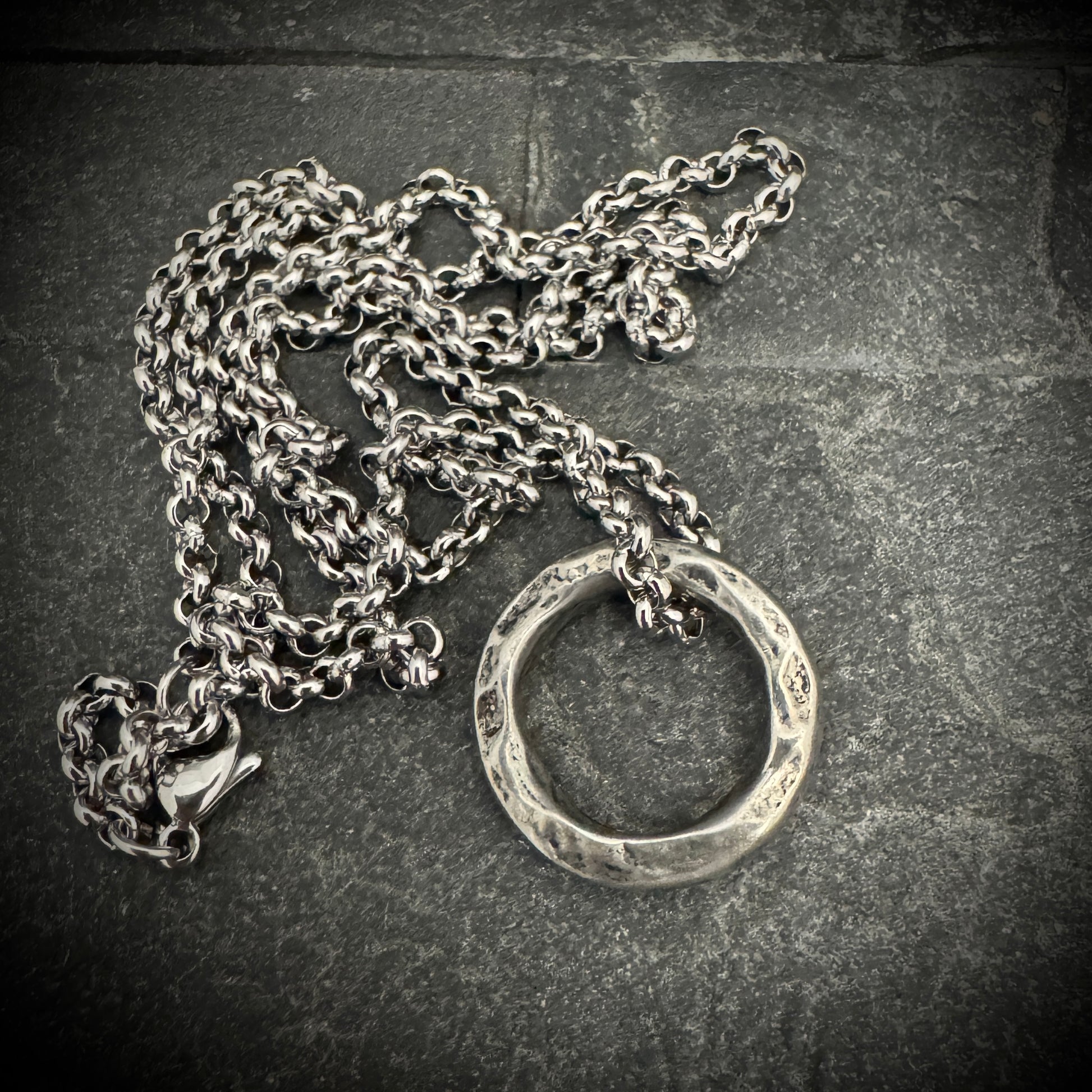 Embrace minimalist sophistication with our Hammered Ring necklace, a symbol of unity and infinity. The textured surface of the ring reflects a hand-forged appearance, giving it an artisanal touch. Dangling from a durable chain, this necklace is a versatile accessory that offers a subtle statement and complements any outfit with its understated elegance.