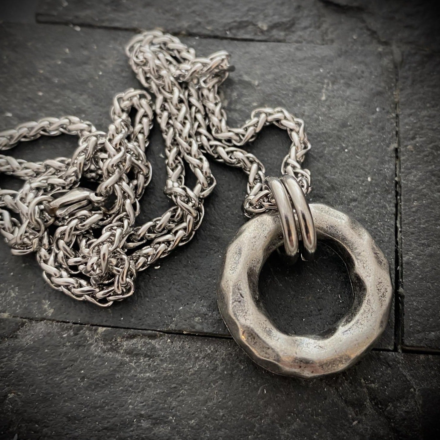 Large Hammered Ring Men's Necklace, Heavy Pewter Ring, Unisex Jewelry, Stainless Steel chain, ST-032