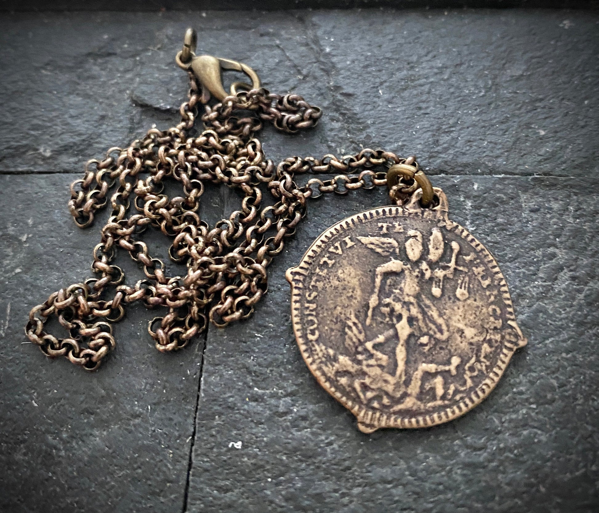 This Johnny LTD design features an Archangel Michael bronze pendant cast from an original that is several hundred years old. This medal is truly unique. The brass necklace is available in 20 or 24 inches in length and looks great in an open collared shirt or over a t-shirt.