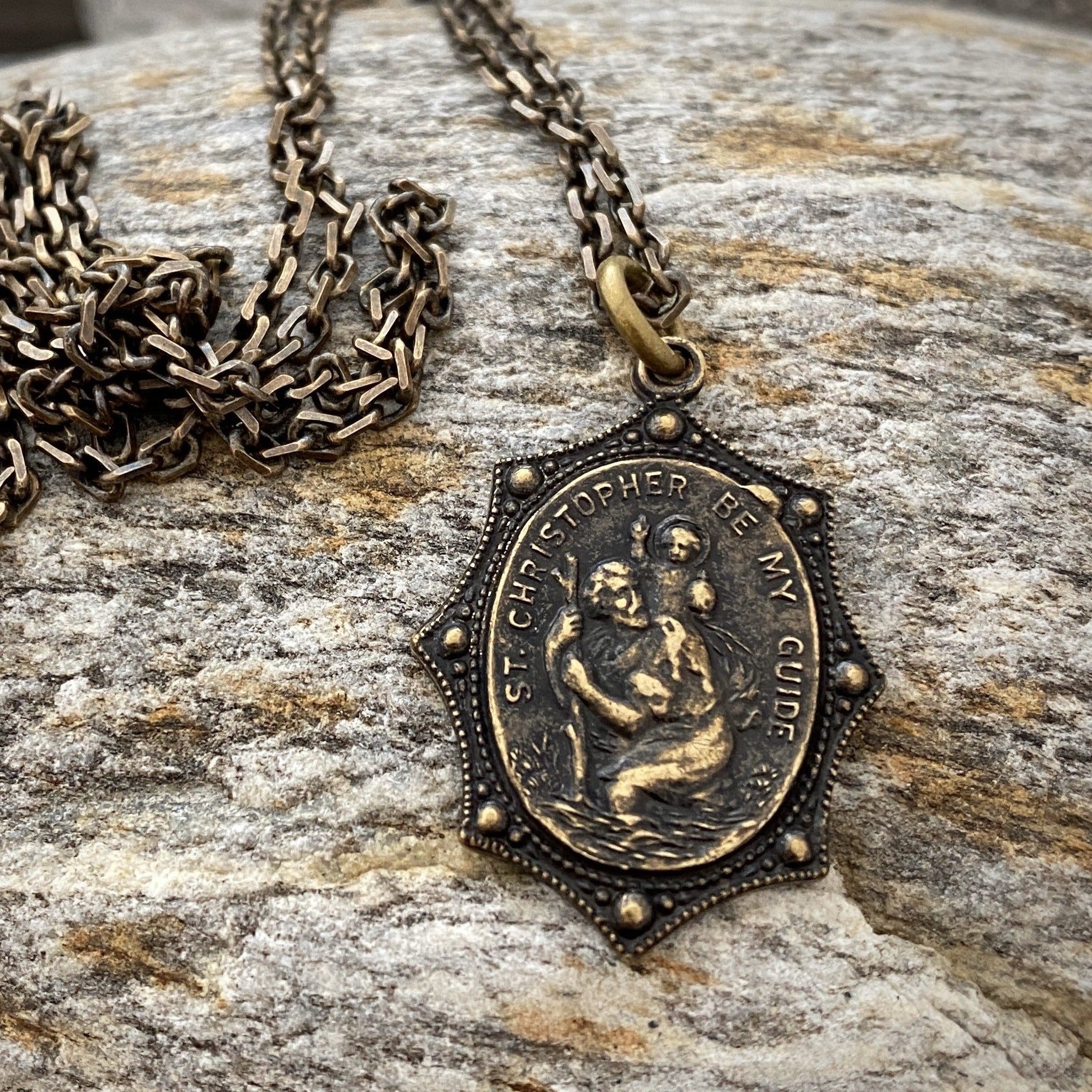 Men's Necklace, Vintage Style St. Christopher, Protection, Protect Us, Patron of travelers, 20 or 24 inches, Antiqued Brass, BR-008
