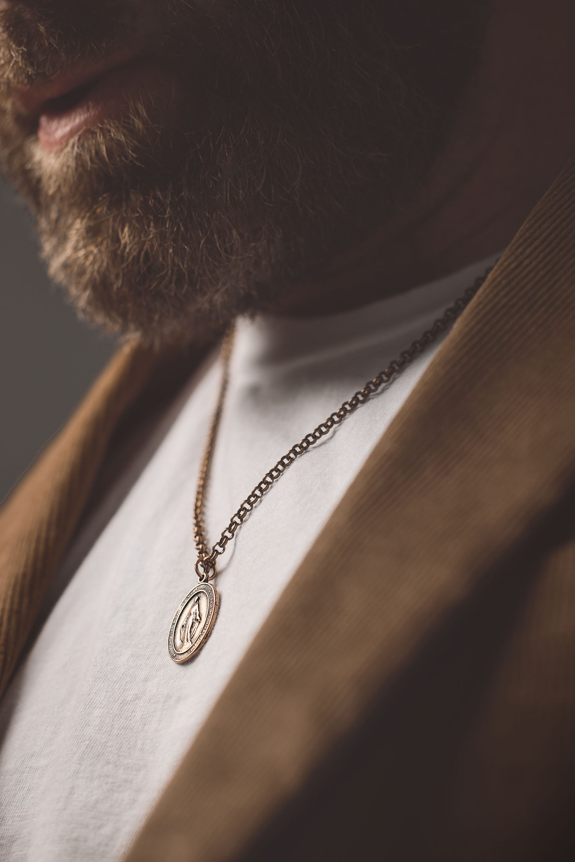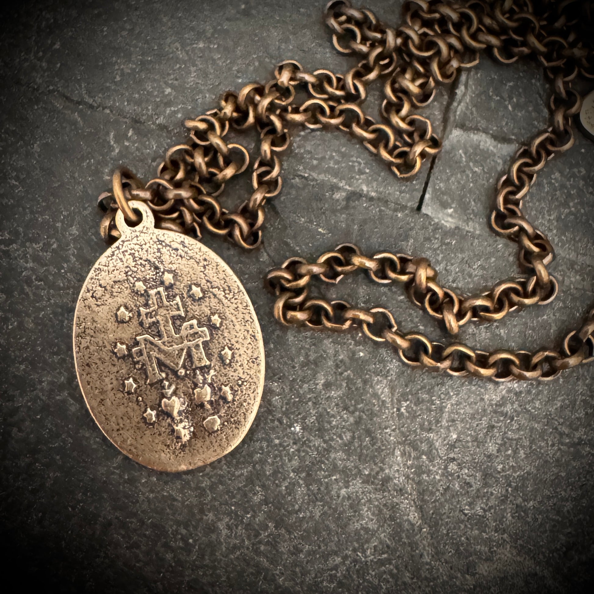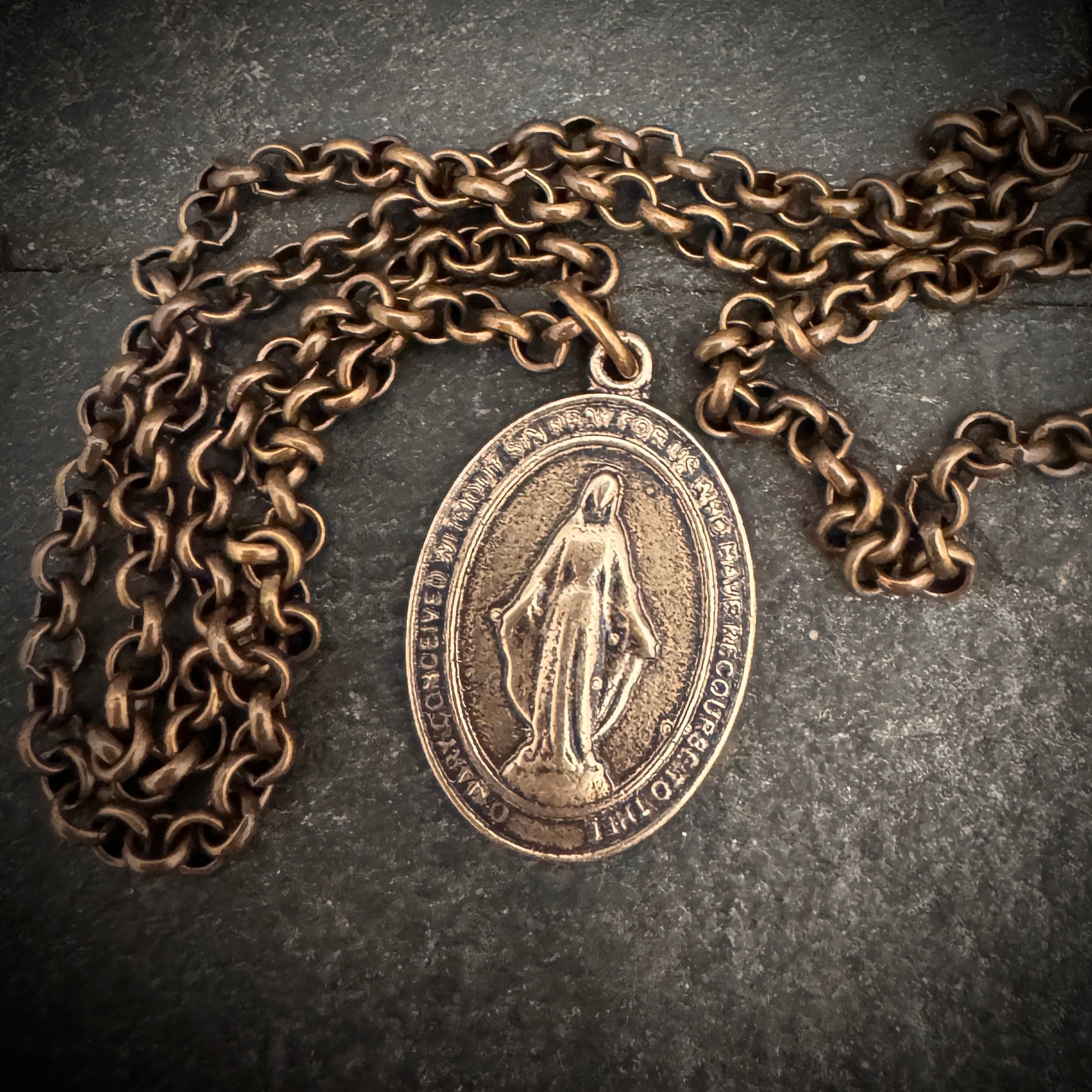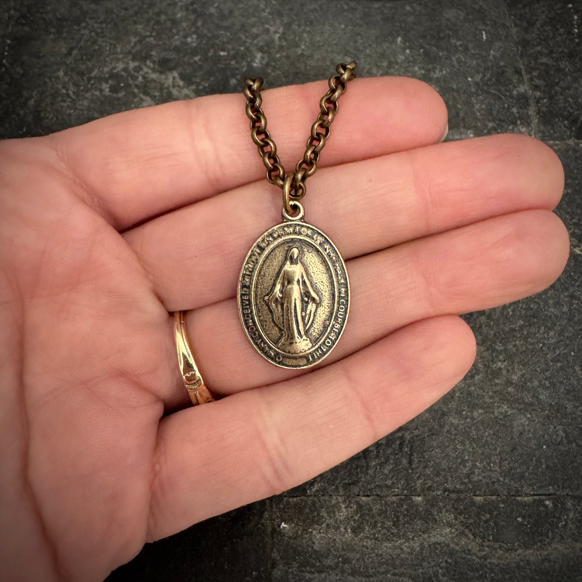 Embrace a sense of divine grace with this Miraculous Mary medal necklace, beautifully rendered in bronze. The oval pendant is a serene representation of the Blessed Virgin, bordered by a delicate inscription that invokes her loving protection. Hanging from a classic bronze chain, this medal is a cherished symbol of faith and a reminder of the miracles that guide and bless the path of the faithful.