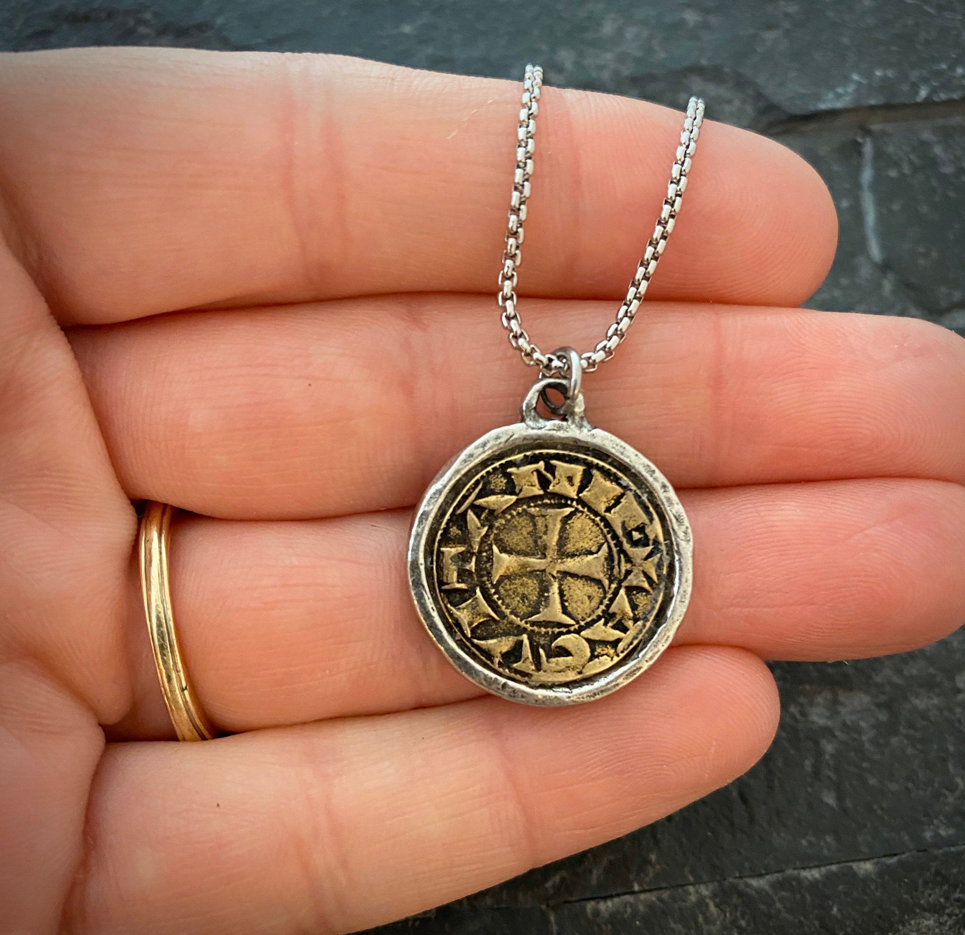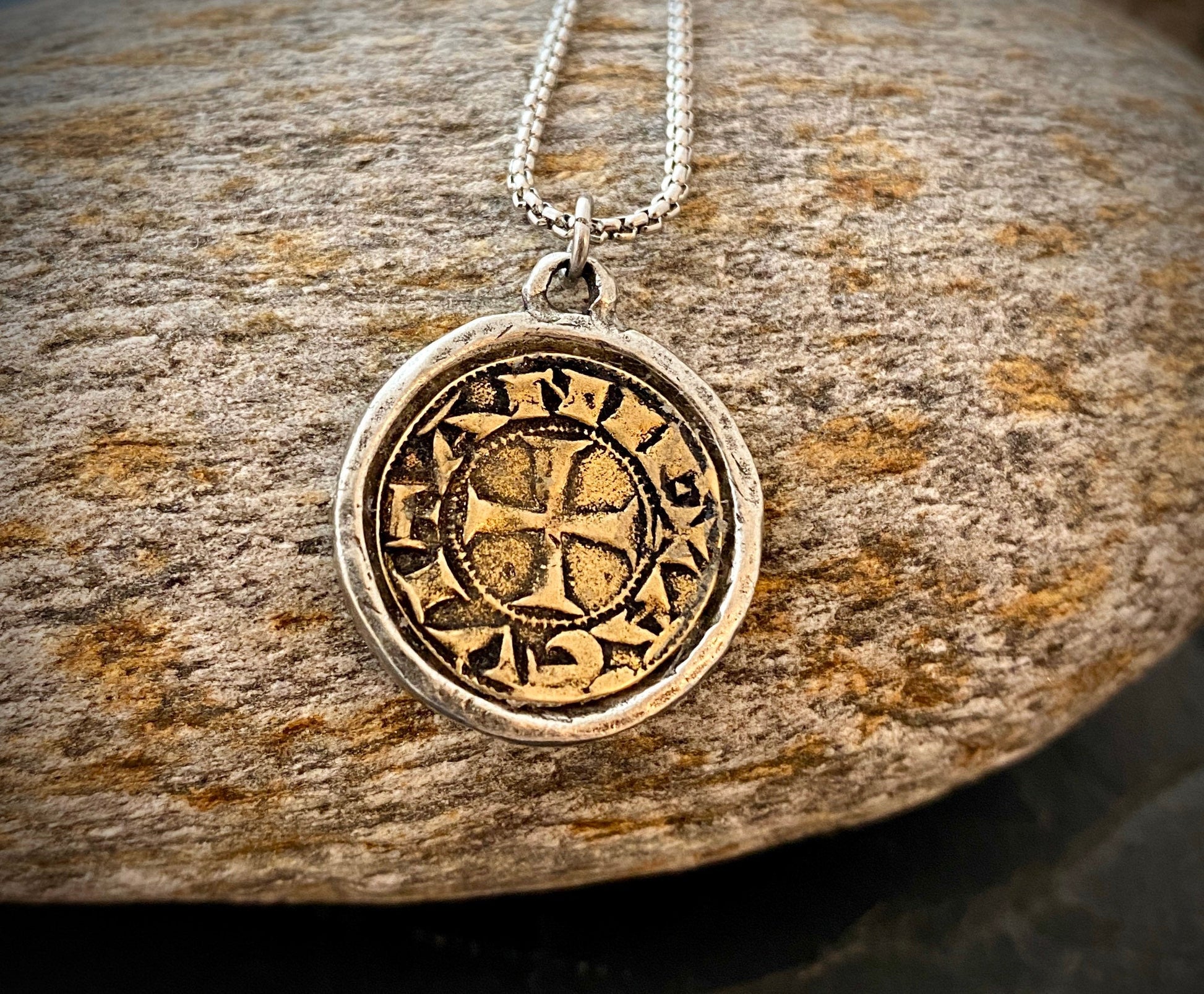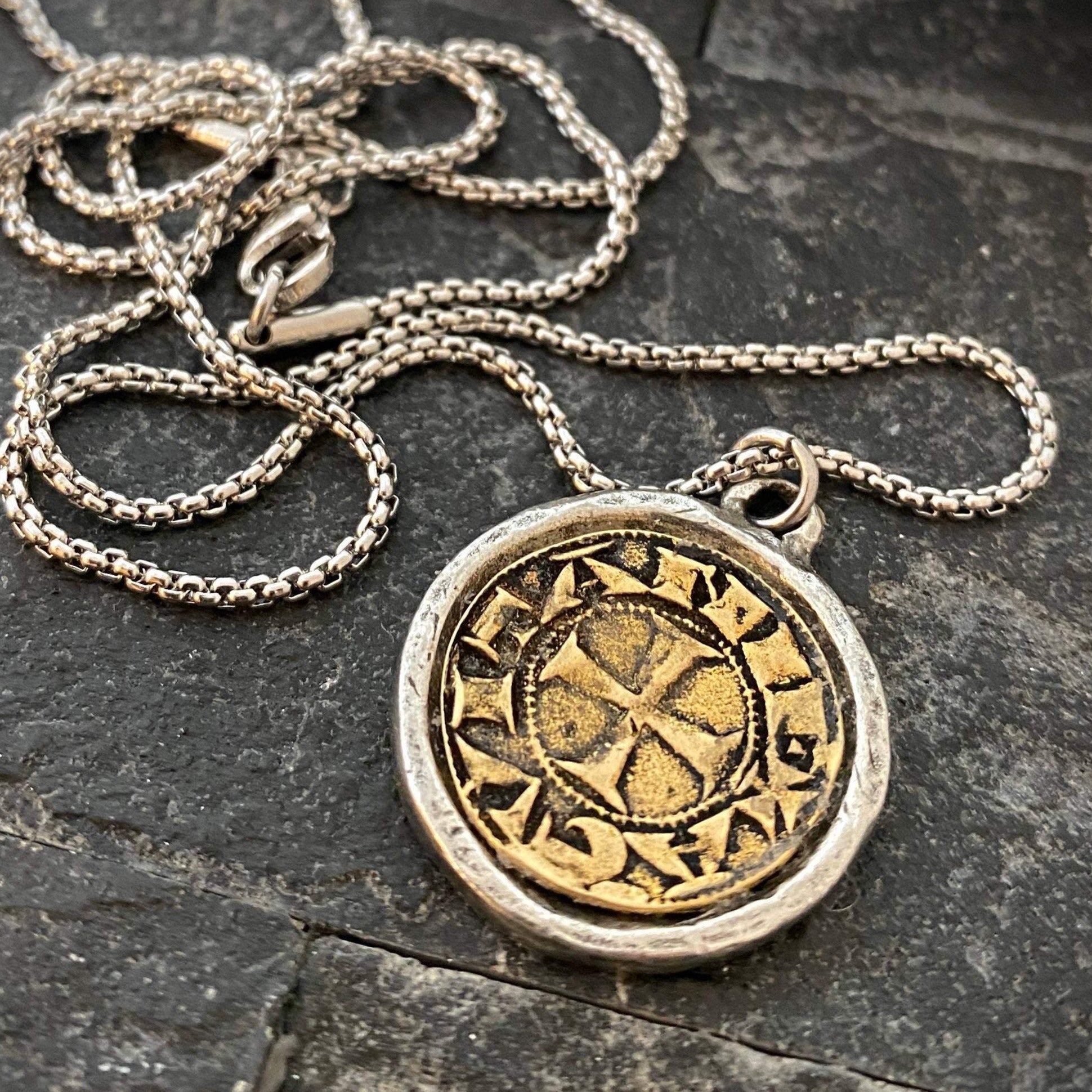 Old Spanish Coin Men's Necklace, Shipwreck Pirate Cross Pendant Brass Two Tone Mixed Medal, Unisex Jewelry, ST-030