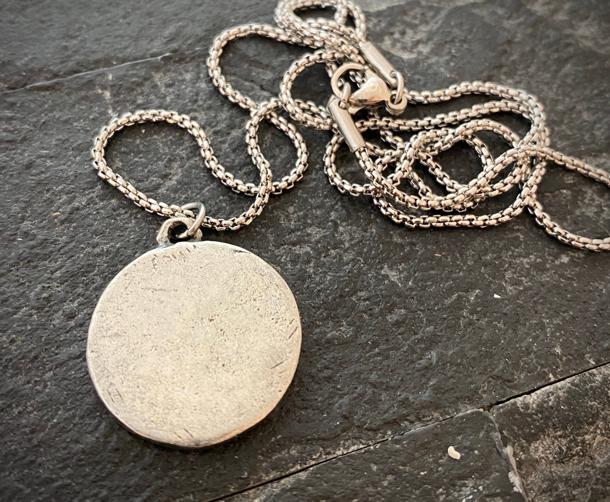 This Johnny LTD design features an old Spanish coin replica that's been cast in solid bronze. We've encased it in silver pewter to create a two-tone necklace with aesthetic depth. This necklace looks great with any outfit. It's available in 20 to 24 inches in length.