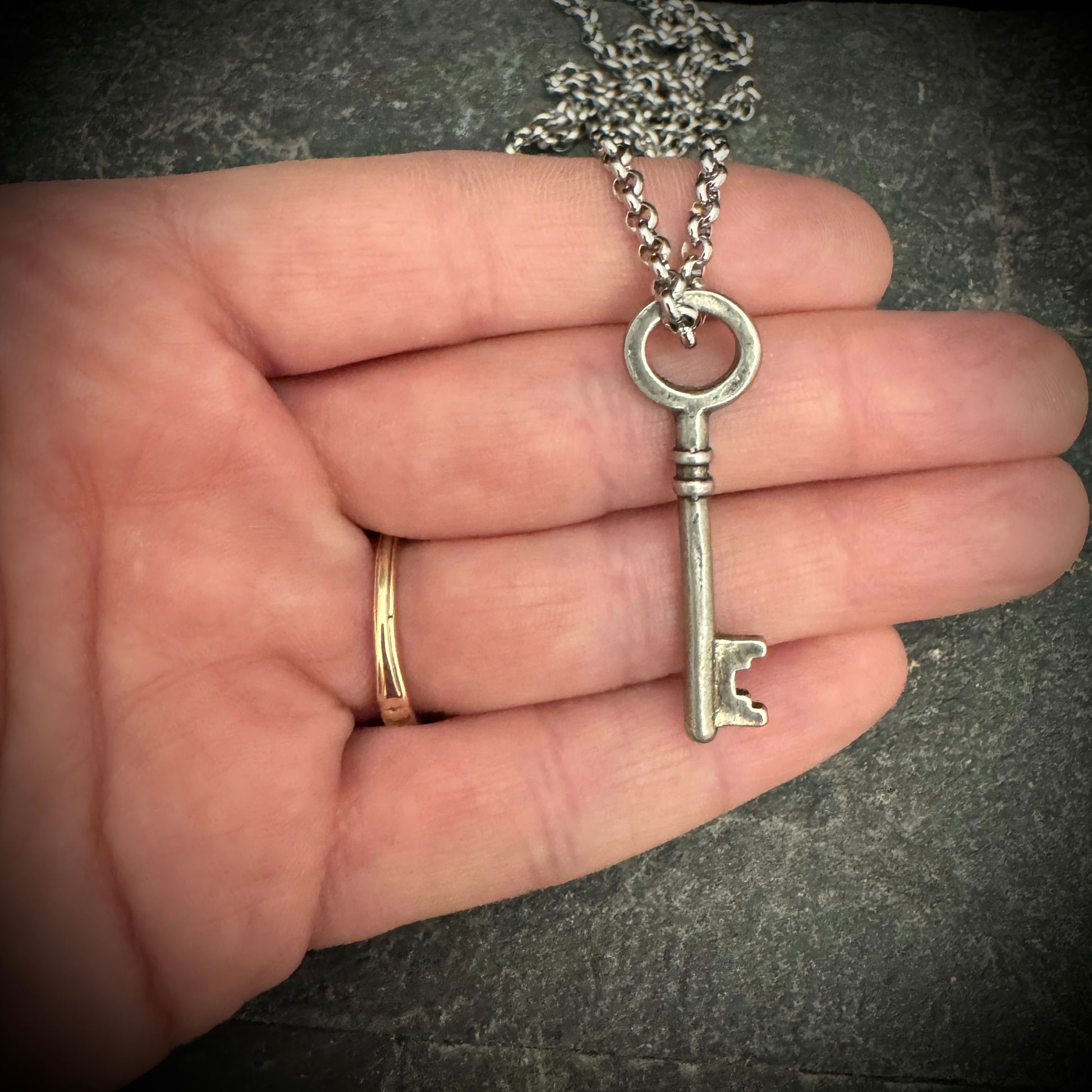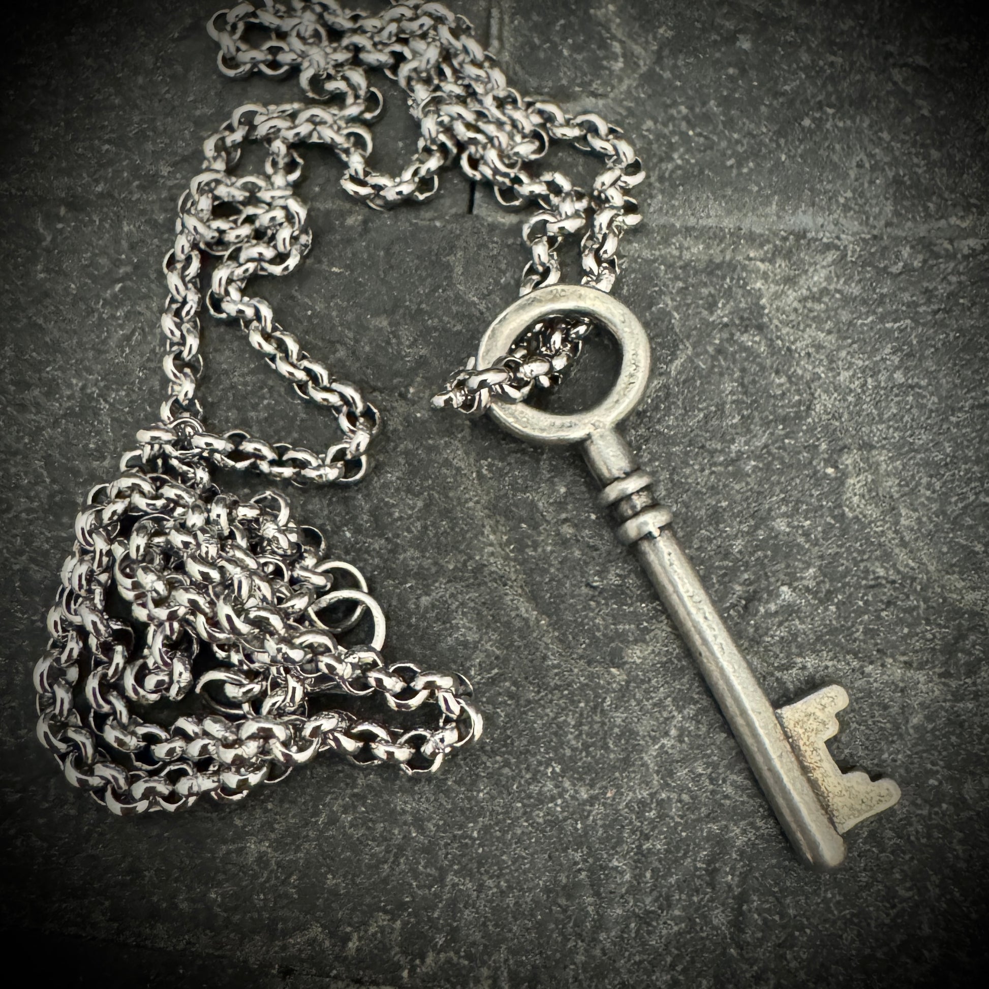 Unlock the charm of times gone-by with this rustic key necklace, a piece steeped in mystery and vintage appeal. The key, with its aged patina and classic design, serves as a metaphor for unlocking life's secrets and adventures, or someone who owns the key to your heart. Elegantly hanging from a matching chain, this necklace is an invitation to wearers to embrace their journey and discover the doors waiting to be opened.