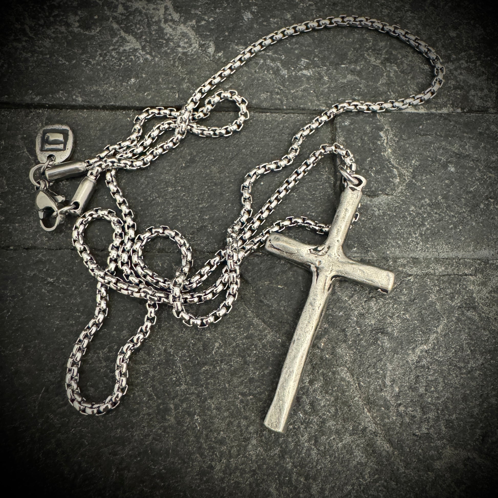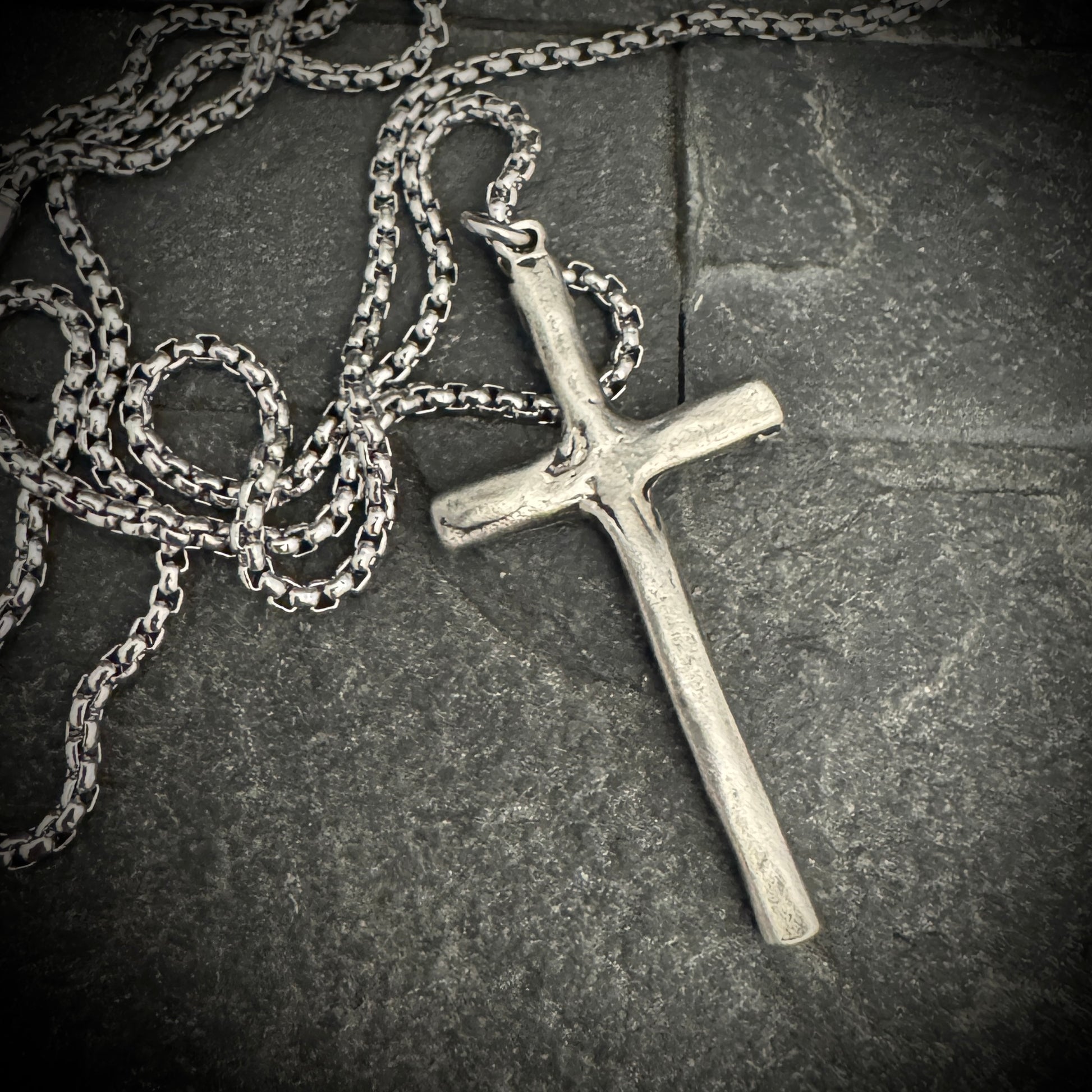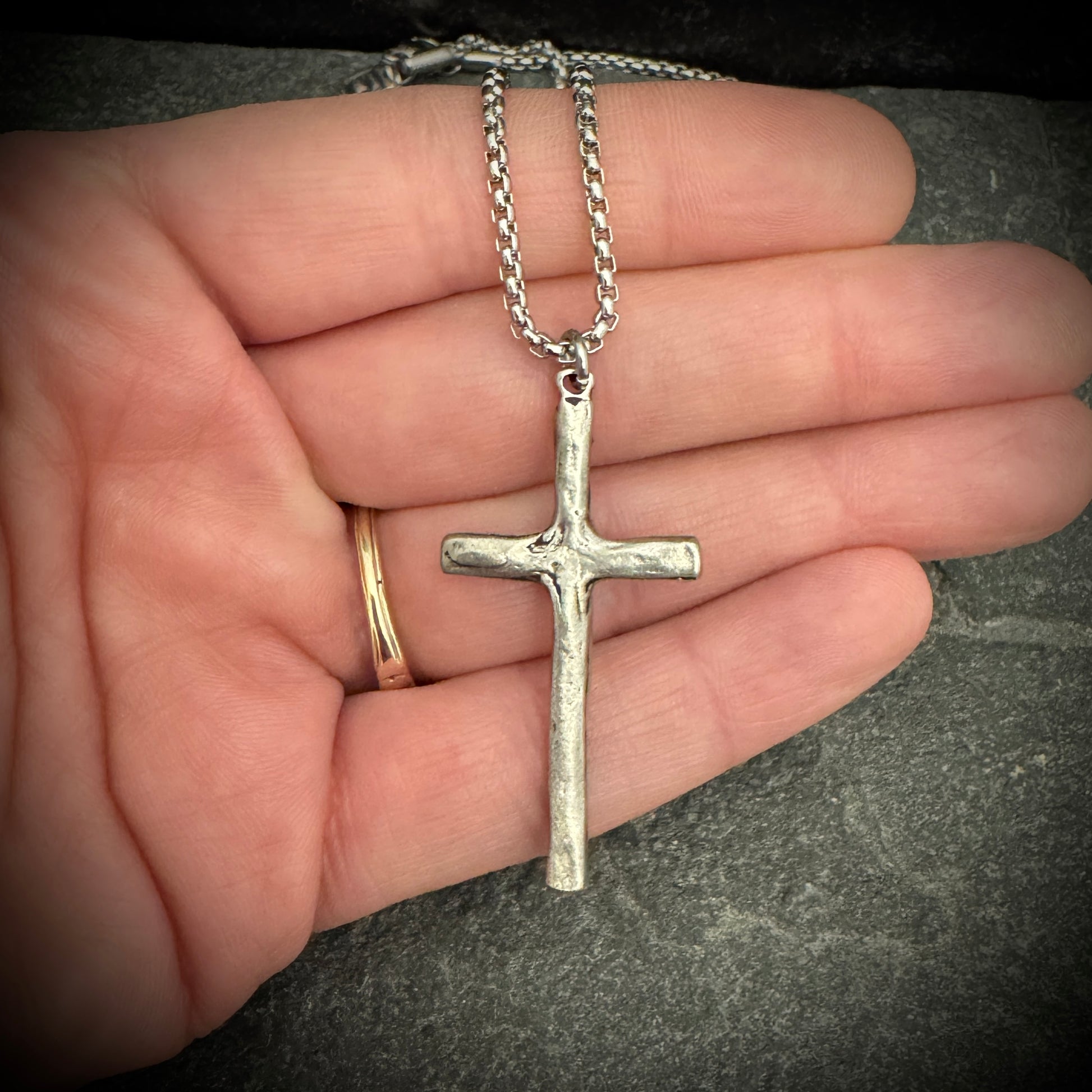 Capturing a sense of ancient craftsmanship, this slender cross necklace presents a hammered texture that reflects a storied past. Each mark on the pendant is a testament to a handcrafted journey, culminating in a symbol that's as personal as it is sacred. The delicate form of the cross, paired with a steel chain, creates a balanced piece, perfect for everyday wear and spiritual reflection.