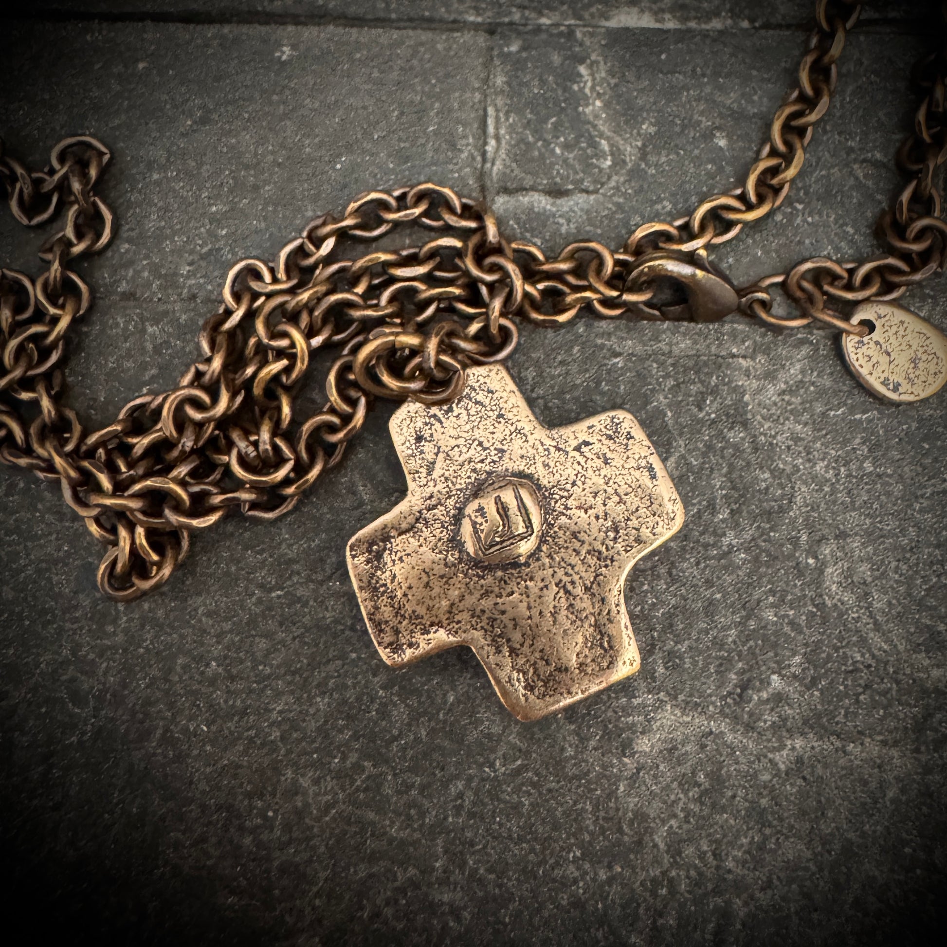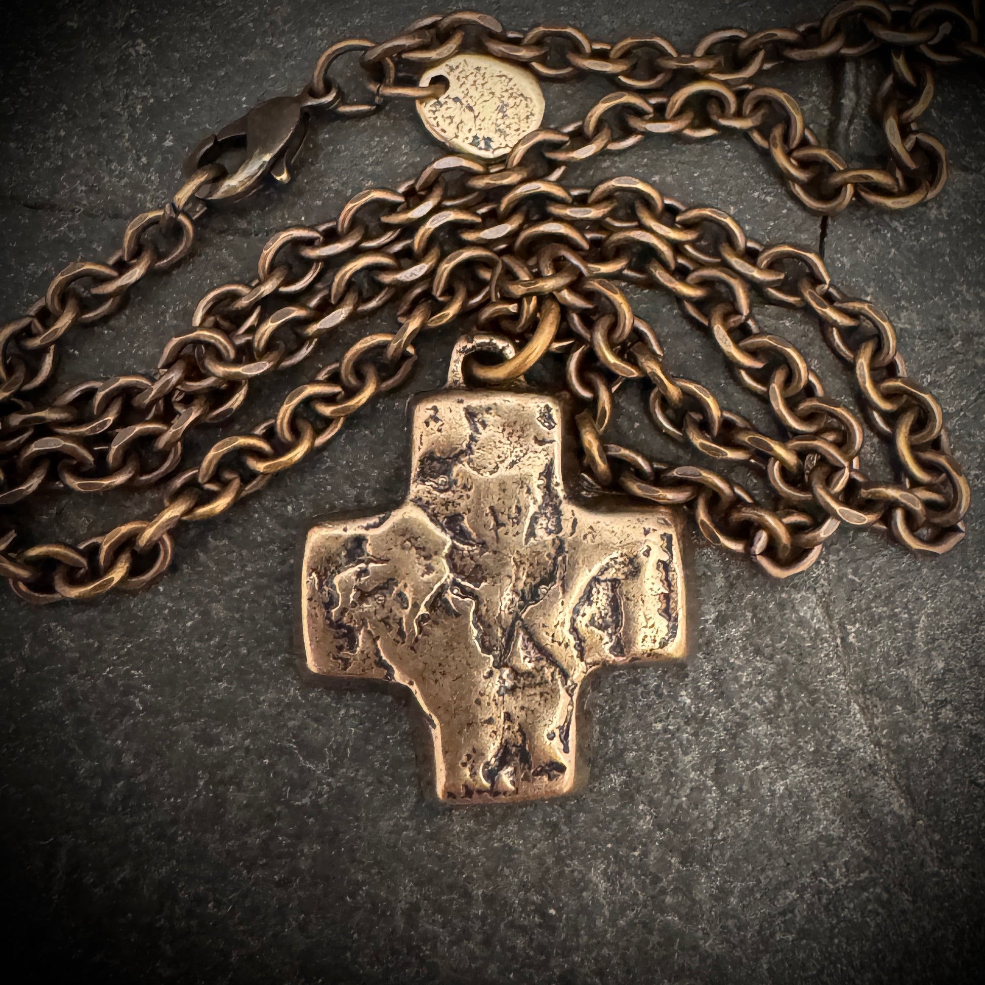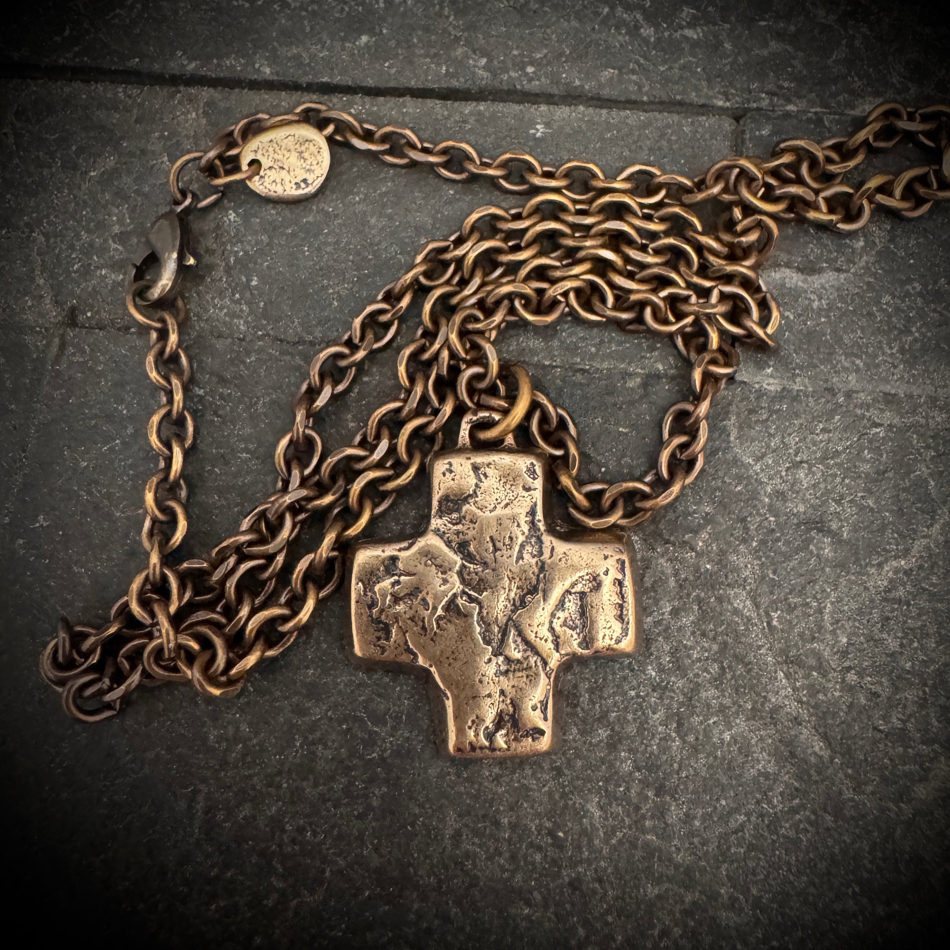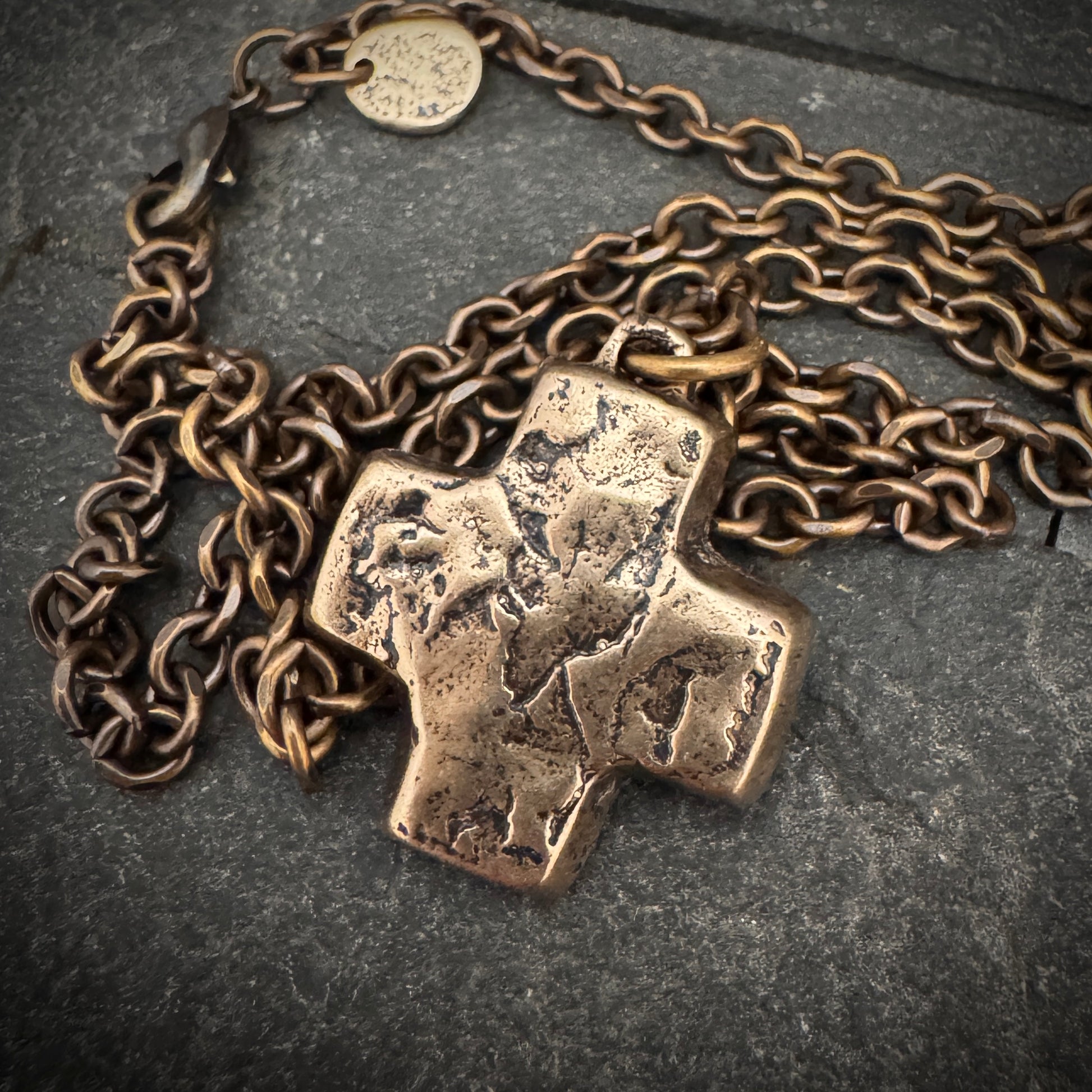 Embrace a touch of medieval elegance with this bronze necklace, featuring a pendant that boasts a symmetrical cross with equal-length arms. Each segment of the cross is textured with subtle, rustic indentations that catch the light, adding an ancient charm to this piece. The pendant hangs from a sturdy chain composed of small, intricately linked bronze loops, creating a harmonious blend of strength and sophistication.