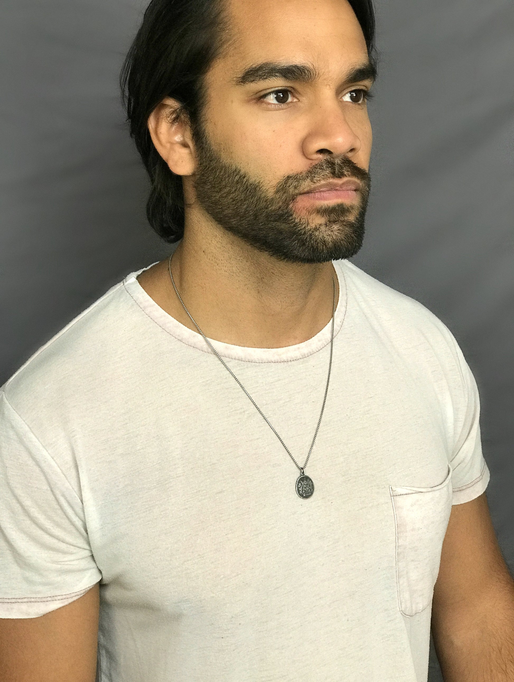This Johnny LTD design features a custom made wax seal that was created for a special purpose - it symbolizes love and two people coming together to begin a new life. In heraldry, the crescent symbolizes one who has been enlightened, the lions represents courage, nobility, royalty, strength, and the elephant stands for stature, wisdom and courage. This sterling necklace is available in 20 and 24 inches in length and looks great in an open collared shirt or over a t-shirt.