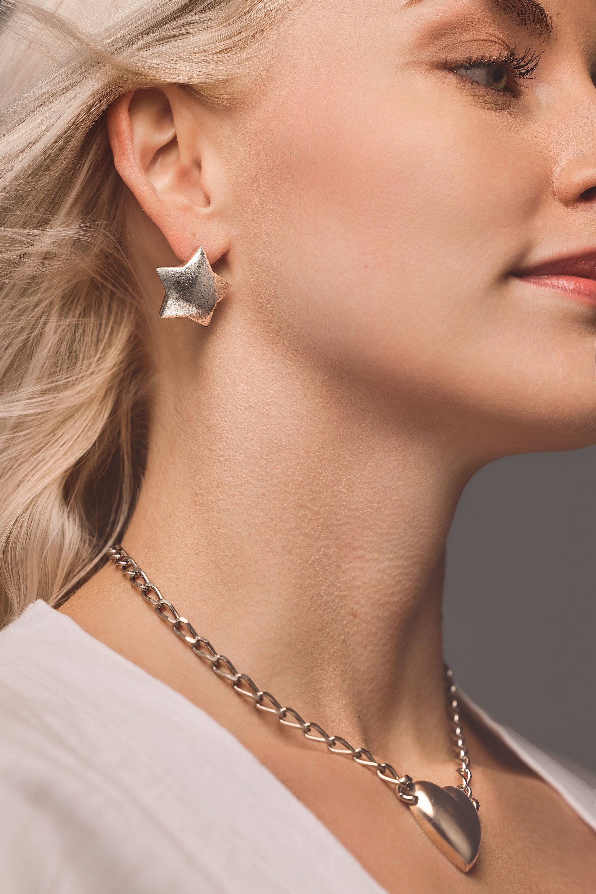 Capture the night sky's sparkle with Johnny LTD's 'Twinkle Posts' earrings. These charming studs are shaped like classic stars with a hand-finished texture that gives them a soft, natural glow reminiscent of a star's twinkle. Fashioned in a plated sterling silver, they bring a subtle yet enchanting shimmer to any look. Their understated size makes them perfect for everyday wear while still adding a touch of magic to your style,