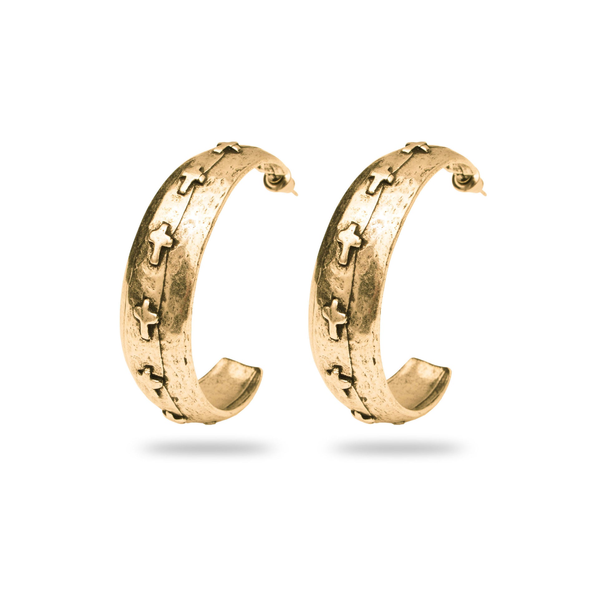Step into a world of old-world charm with Johnny LTD's Venice Hoops. These exquisite earrings are hand-designed to emulate the rustic elegance of Venetian artistry. Each hoop is crafted with a series of crosses, reminiscent of the detailed stonework found in historic Venetian architecture. The textured, 14k gold plated finish gives them an antiqued look, as if they were treasures from a bygone era. Despite their ancient inspiration, the hoops maintain a modern edge, perfect for adding a sophisticated and artistic statement to any outfit.