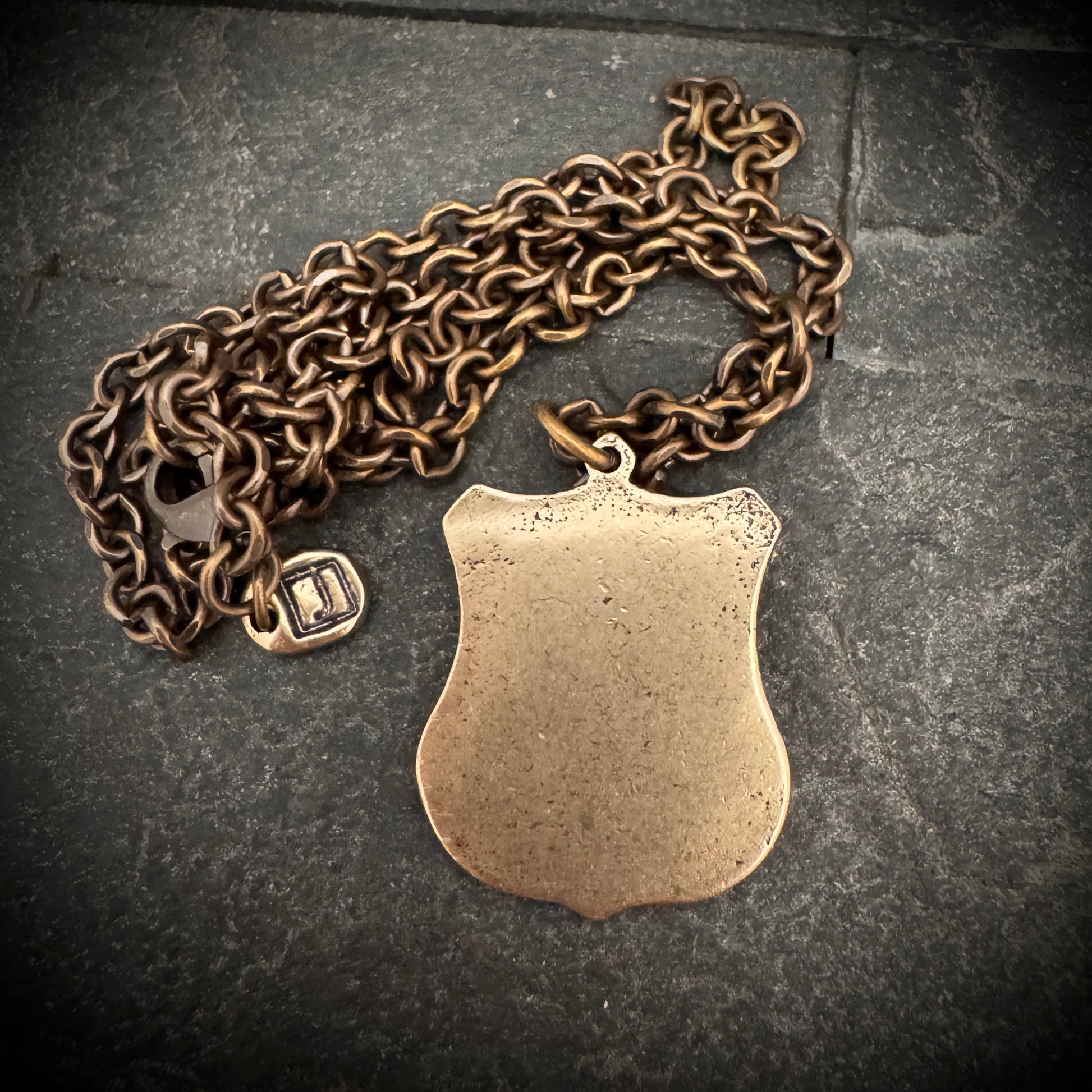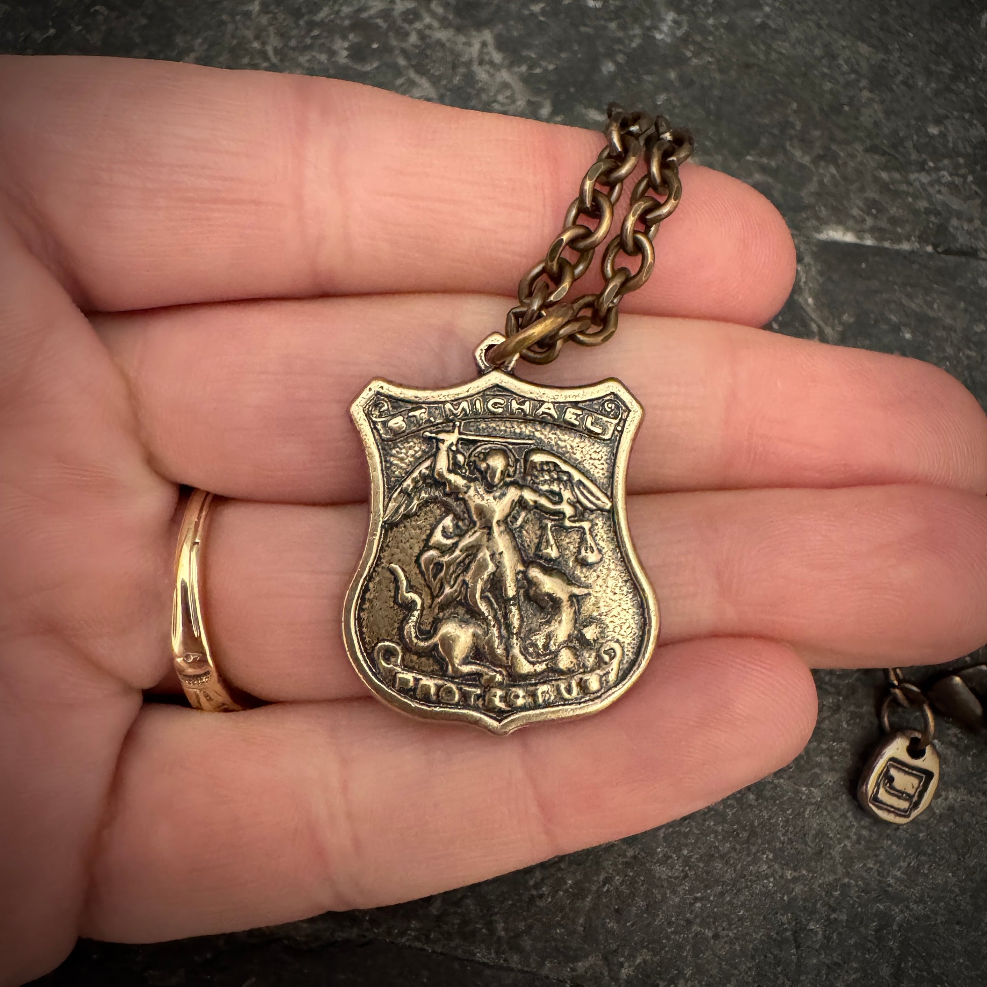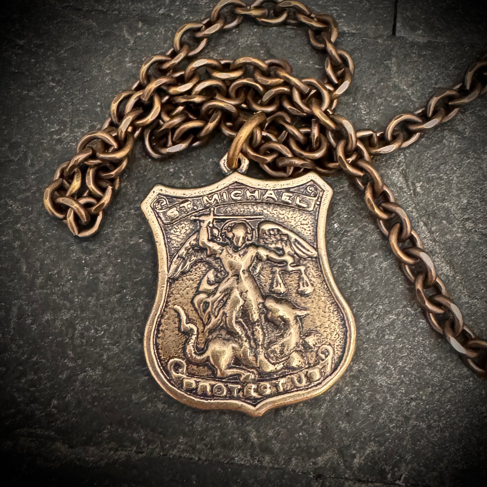 Embody the divine protection of the archangel with this bronze 'St. Michael' pendant necklace. Engraved with the powerful invocation 'Protect Us', this shield-shaped amulet captures the essence of St. Michael's guardian spirit. The intricately detailed depiction of the saint, along with the prayerful plea, makes this piece not just a statement of faith but a beacon of hope and strength, suspended from a resilient bronze chain.